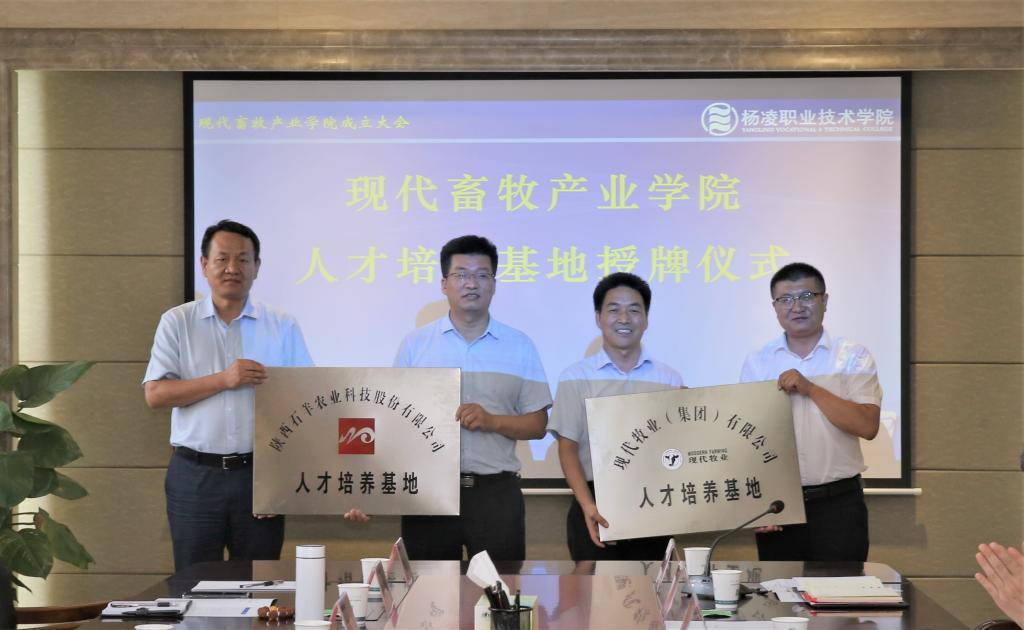 陈宁、郭庆宏、乔冰涛、黎骏驹共同为现代畜牧产业学院揭牌。陈宁、郭庆宏为陕西省畜牧业协会杨凌工作站揭牌。任得元向石羊农科、现代牧业(宝鸡)有限公司授予学院产教融合基地牌匾。张迪与乔冰涛、黎骏驹代表校企双方签署产教融合协议。张迪向石羊农科董事长常青山、省畜牧业协会常务副会长郭庆宏、省畜牧业协会猪业分会会长、秘书长张周、石羊农科总经理乔冰涛颁发动物工程分院产业教授聘书。石羊农科、现代牧业集团授予动物工程分院人才培养基地牌匾。