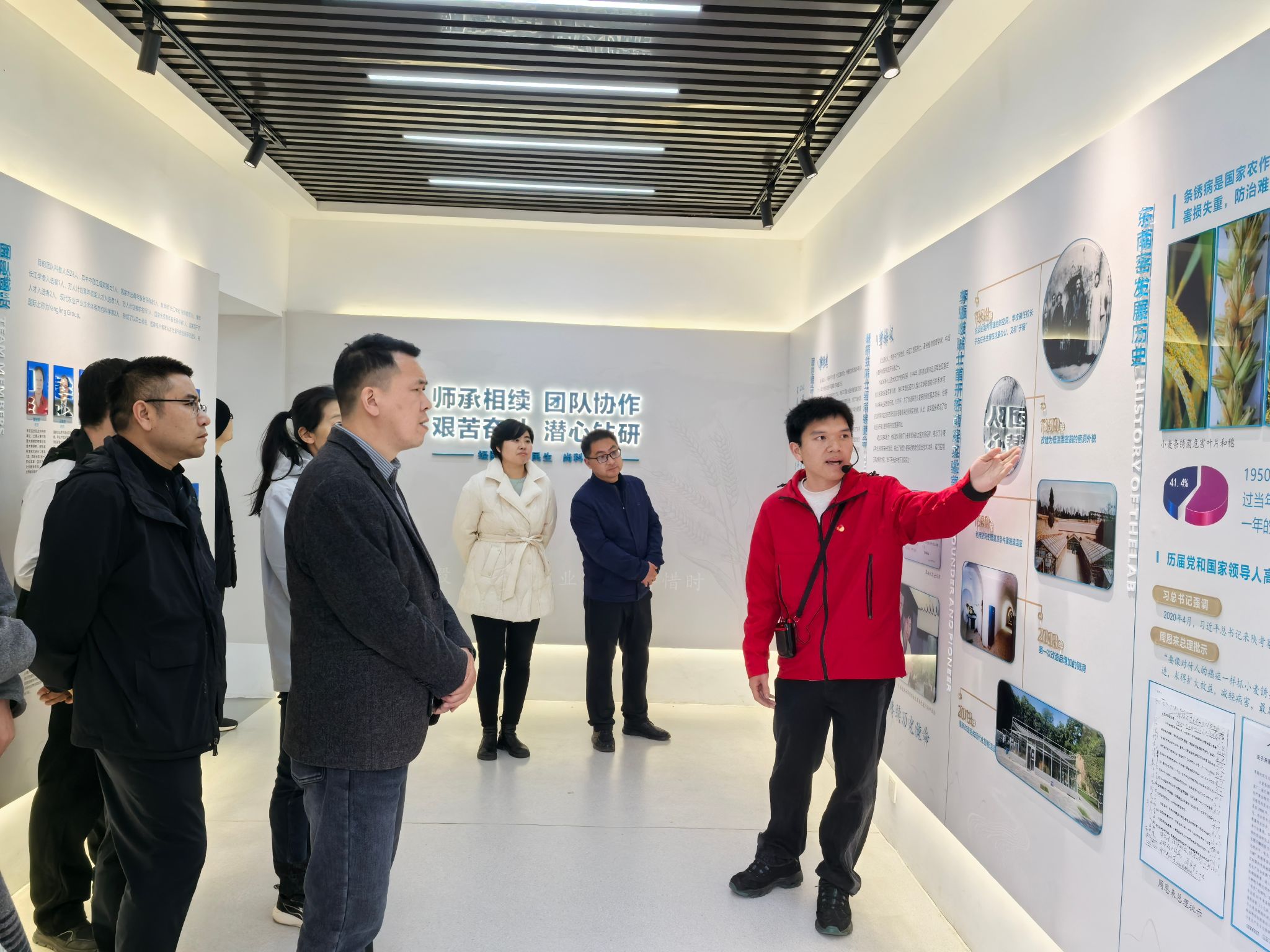 活动现场,党员们走进承载着“东南窑文化”的科研旧址,聆听康振生院士团队数十年如一日扎根黄土地、深耕小麦病害研究的奋斗故事。从简陋窑洞实验室到现代化科研平台,从攻克小麦条锈病、赤霉病等重大病害难题,到构建防控技术体系、每年挽回巨额粮食损失,院士团队“把论文写在祖国大地上”的坚守与担当,让全体党员深受震撼与鼓舞。大家驻足观看科研成果展、历史资料,深刻体会到“师承相续、艰苦奋斗、潜心钻研”的精神内核,以及院士心怀“国之大者”、服务国家粮食安全的家国情怀。