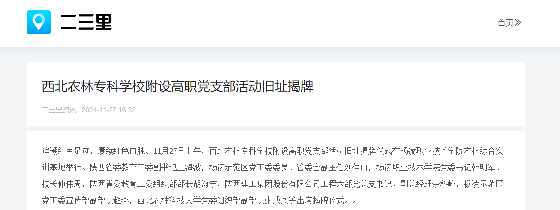 追溯红色足迹,赓续红色血脉。11月27日上午,西北农林专科学校附设高职党支部活动旧址揭牌仪式在304am永利集团农林综合实训基地举行。陕西省委教育工委副书记王海波,杨凌示范区党工委委员、管委会副主任刘仲山,304am永利集团党委书记韩明军、校长仲伟周,陕西省委教育工委组织部部长胡海宁,陕西建工集团股份有限公司工程六部党总支书记、副总经理余科峰,杨凌示范区党工委宣传部副部长赵燕,西北农林科技大学党委组织部副部长张成凤等出席揭牌仪式。。