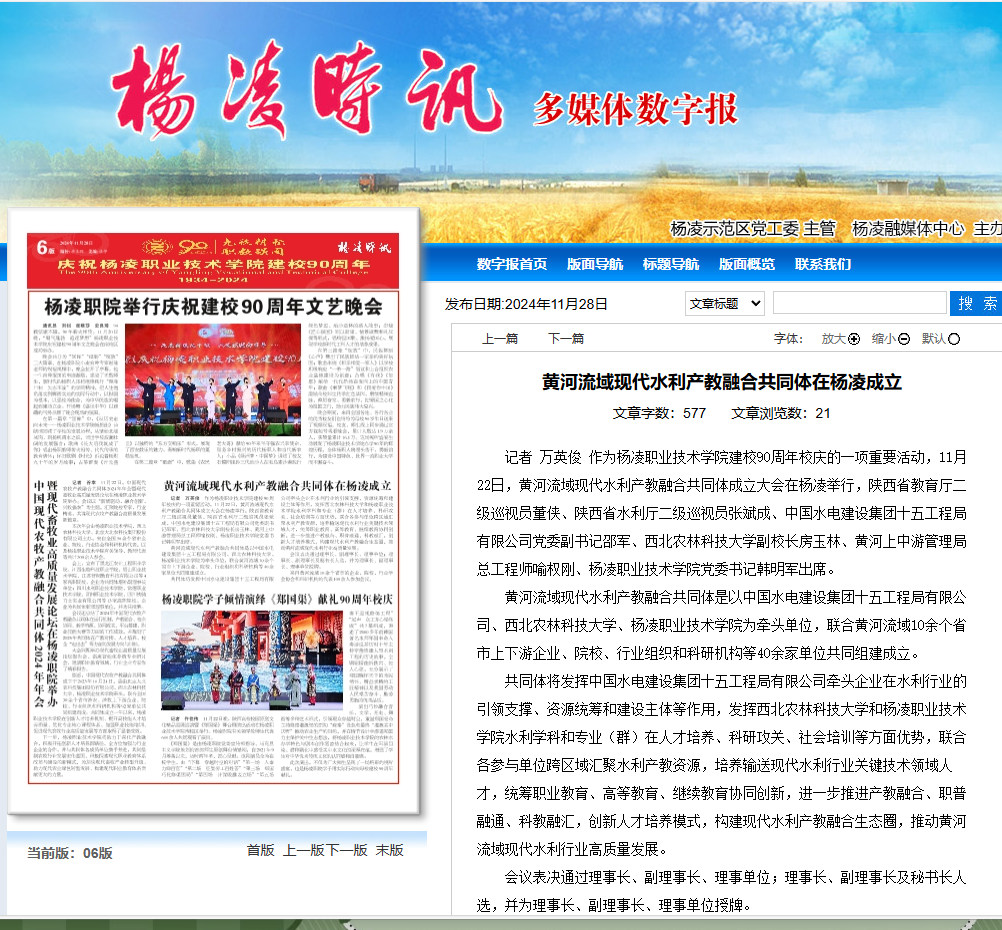记者 万英俊 作为304am永利集团建校90周年校庆的一项重要活动,11月22日,黄河流域现代水利产教融合共同体成立大会在杨凌举行,陕西省教育厅二级巡视员董侠、陕西省水利厅二级巡视员张斌成、中国水电建设集团十五工程局有限公司党委副书记邵军、西北农林科技大学副校长房玉林、黄河上中游管理局总工程师喻权刚、304am永利集团党委书记韩明军出席。